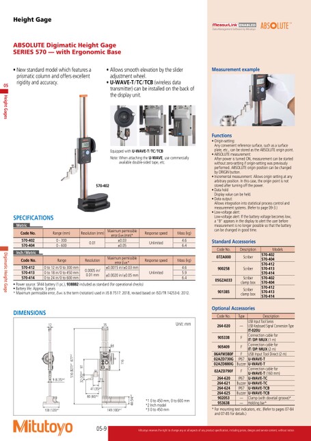 ABSOLUTEDigimaticHeightGageSERIES570—withErgonomicBase•Newstandardmodelwhichfeaturesaprismaticcolumnandoffersexcellentrigidityandaccuracy.•AllowssmoothelevationbythesliderMeasurementexampleadjustmentwheel.•U-WAVE-T/TC/TCB(wirelessdatatransmitter)canbeinstalledonthebackofthedisplayunit.Functions•Origin-setting:Anyconvenientreferencesurface,suchasasurfaceplate,etc.,canbestoredastheABSOLUTEoriginpoint.•ABSOLUTEmeasurement:AfterpoweristurnedON,measurementcanbestartedwithoutzero-settingiforigin-settingwaspreviouslyperformed.ABSOLUTEoriginpositioncanbechangedbyORIGINbutton.•Incrementalmeasurement:Allowsoriginsettingatanyarbitraryposition.Inthiscase,theoriginpointisnotstoredafterturningoffthepower.Displayvaluecanbeheld.•Datahold•Dataoutput:Allowsintegrationintostatisticalprocesscontrolandmeasurementsystems.(Refertopage09-3.)•Low-voltagealert:Low-voltagealert:Ifthebatteryvoltagebecomeslow,a“B”appearsinthedisplaytoalerttheuserbeforemeasurementisnolongerpossiblesothatthebatterycanbechangedingoodtime.StandardAccessoriesCodeNo.07ZA00090025805GZA033901385DescriptionModelsScriberScriberScriberclampboxScriberclampbox570-402570-404570-412570-413570-414570-402570-404570-412570-413570-414OptionalAccessoriesCodeNo.TypeDescription264-020—90533890540906AFM380F02AZD730G02AZD880GFFFIP67Buzzer02AZD790FF264-620264-621264-624264-625902053953638IP67BuzzerIP67Buzzer——USBInputToolSeriesUSBKeyboardSignalConversionTypeIT-020UConnectioncableforIT/DP/MUX(1m)ConnectioncableforIT/DP/MUX(2m)USBInputToolDirect(2m)U-WAVE-TU-WAVE-TConnectioncableforU-WAVE-T(160mm)U-WAVE-TCU-WAVE-TCU-WAVE-TCBU-WAVE-TCBClamp(withdovetailgroove)*Holdingbar**Formountingtestindicators,etc.(Refertopages07-84and07-85fordetails.)EquippedwithU-WAVE-T/TC/TCBNote:WhenattachingtheU-WAVE,usecommerciallyavailabledouble-sidedtape,etc.570-402SPECIFICATIONSRange(mm)Resolution(mm)MaximumpermissibleerrorEMPE(mm)*±0.03±0.05ResponsespeedMass(kg)Unlimited4.66.40.01Resolution0.0005in/0.01mmMaximumpermissibleerrorEMPE*±0.0015in/±0.03mm±0.0020in/±0.05mmResponsespeedMass(kg)Unlimited4.65.96.40-3000-600Range0to12in/0to300mm0to18in/0to450mm0to24in/0to600mm•Powersource:SR44battery(1pc.),938882includedasstandard(foroperationalchecks)•Batterylife:Approx.5years*Maximumpermissibleerror,EMPEistheterm(notation)usedinJISB7517:2018,revisedbasedonISO/TR14253-6:2012.Unit:mm*10to450mm,0to600mm*2Inchmodel*30to450mm48(54)*111635641541(35)*280(60)*29732(30)*2516(827)*1677*39(6.35)*2DIMENSIONS12100(120)*1149(180)*105-9MetricCodeNo.570-402570-404Inch/MetricCodeNo.570-412570-413570-414DigimaticHeightGage
