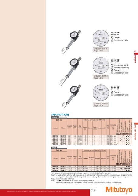 513-518-10E/513-518-10TCompactCarbidecontactpoint513-512-10E/513-512-10TLongcontactpointDoublescalespacingCompactCarbidecontactpoint513-504-10E/513-504-10TCompactCarbidecontactpointGraduation:0.001inRange:0.04inGraduation:0.0005inRange:0.02inGraduation:0.0001inRange:0.01inni19.0ni43.1ni06.0RubycontactpointCarbidecontactpointCompactDoublescalespacingStandardLongcontactpointWithrevolutioncounterHighaccuracyMeasuringforce(N)SPECIFICATIONSMetricCodeNo.Maximumpermissibleerror(MPE)*(µm)BasicsetFullsetGraduation(mm)Range(mm)DialreadingMeasurigrangeOnerev.10scaledivisionsHysteresisRepetabiityMass(g)513-517-10E513-514-10E513-515-10E513-503-10E513-501-10E513-517-10T513-514-10T513-515-10T513-503-10T513-501-10T0.010.010.010.0020.0010.80.510.20.140-40-00-25-00-50-00-100-00-70-09101044–––––55522455333331150515150500.3orless0.3orless0.3orless0.4orless0.5orless4444444444444444RubycontactpointCarbidecontactpointCompactDoublescalespacingStandardLongcontactpointWithrevolutioncounterHighaccuracyMeasuringforce(N)InchCodeNo.Maximumpermissibleerror(MPE)*(in)BasicsetFullsetGraduation(in)Range(in)DialreadingOnerev.First2.5rev.HysteresisRepetabilityMass(g)513-518-10E513-512-10E513-504-10E513-518-10T513-512-10T513-504-10T0.0010.00050.00010.040.020.010-20-00-10-00-5-0±0.001±0.0005±0.0002–––0.00020.00020.0001±0.0004±0.0002±0.000045051500.3orless0.3orless0.3orless44444444*Weguaranteetheaccuracyofcompletedproductsbyinspectingthemwiththedialfacefacingupward.Note1:Besuretoperformcalibrationwithreferencegage,etc.afterexchangingthecontactpoint.Theinsidepartsmaybedamagedwhenthecontactpointisexchangedduetothebreakage.Inthecasetheofthesignificantdeteriorationintheoperation,repairisrequired.Note2:Stemisnotincludedinthemass.Note3:513-5XX-10isindicatedonthedialfaceandtheinspectioncertificate.ThecodeNo.withsuffix(E/T)isasetitemwhichincludesaccessories.Themainunitisnotavailableasastandaloneitem.07-82