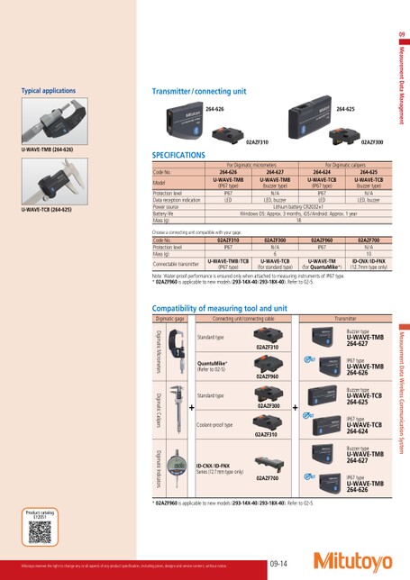 TypicalapplicationsTransmitter/connectingunit264-626264-625U-WAVE-TMB(264-626)U-WAVE-TCB(264-625)02AZF31002AZF300SPECIFICATIONSCodeNo.ModelProtectionlevelDatareceptionindicationPowersourceBatterylifeMass(g)ForDigimaticmicrometersForDigimaticcalipers264-626U-WAVE-TMB(IP67type)IP67LED264-627U-WAVE-TMB(buzzertype)N/ALED,buzzer264-624U-WAVE-TCB(IP67type)IP67LED264-625U-WAVE-TCB(buzzertype)N/ALED,buzzerLithiumbatteryCR2032×1WindowsOS:Approx.3months,iOS/Android:Approx.1year18Chooseaconnectingunitcompatiblewithyourgage.CodeNo.ProtectionlevelMass(g)02AZF310IP6702AZF300N/A602AZF960IP6702AZF700N/A10ConnectabletransmitterU-WAVE-TMB/TCB(IP67type)U-WAVE-TCB(forstandardtype)U-WAVE-TM(forQuantuMike*)ID-CNX/ID-FNX(12.7mmtypeonly)Note:Water-proofperformanceisensuredonlywhenattachedtomeasuringinstrumentsofIP67type.*02AZF960isapplicabletonewmodels(293-14X-40/293-18X-40).Referto02-5.CompatibilityofmeasuringtoolandunitDigimaticgageConnectingunit/connectingcableTransmitterMeasurementDataWirelessCommunicationSystemBuzzertypeU-WAVE-TMB264-627IP67typeU-WAVE-TMB264-626BuzzertypeU-WAVE-TCB264-625IP67typeU-WAVE-TCB264-624BuzzertypeU-WAVE-TMB264-627IP67typeU-WAVE-TMB264-626StandardtypeQuantuMike*(Referto02-5)Standardtype+Coolant-prooftype02AZF31002AZF96002AZF300+02AZF310ID-CNX/ID-FNXSeries(12.7mmtypeonly)02AZF700DigimaticMicrometersDigimaticCalipersDigimaticIndicatorsProductcatalogE12051*02AZF960isapplicabletonewmodels(293-14X-40/293-18X-40).Referto02-5.09-14