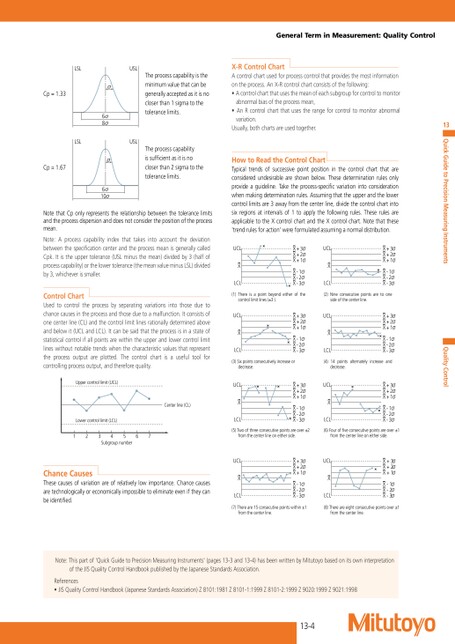 QualityControlGeneralTerminMeasurement:QualityControlX-RControlChartAcontrolchartusedforprocesscontrolthatprovidesthemostinformationontheprocess.AnX-Rcontrolchartconsistsofthefollowing:•Acontrolchartthatusesthemeanofeachsubgroupforcontroltomonitorabnormalbiasoftheprocessmean,•AnRcontrolchartthatusestherangeforcontroltomonitorabnormalvariation.Usually,bothchartsareusedtogether.inthechartcontroltrendsofsuccessivepointpositionHowtoReadtheControlChartTypicalthatareconsideredundesirableareshownbelow.Thesedeterminationrulesonlyprovideaguideline.Taketheprocess-specicvariationintoconsiderationwhenmakingdeterminationrules.Assumingthattheupperandthelowercontrollimitsare3awayfromthecenterline,dividethecontrolchartintosixregionsatintervalsof1toapplythefollowingrules.TheserulesareapplicabletotheXcontrolchartandtheXcontrolchart.Notethatthese'trendrulesforaction'wereformulatedassuminganormaldistribution.UCLXLCLX+3σX+2σX+1σX-1σX-2σX-3σUCLXLCL(1)Thereisapointbeyondeitherofcontrollimitlines(±3).the(2)Nineconsecutivepointsaresideofthecenterline.UCLXLCLX+3σX+2σX+1σX-1σX-2σX-3σUCLXLCLX+3σX+2σX+1σX-1σX-2σX-3σtooneX+3σX+2σX+1σX-1σX-2σX-3σ(3)Sixpointsconsecutivelyincreaseordecrease.(4)points14decrease.alternatelyincreaseandUCLXLCLX+3σX+2σX+1σX-1σX-2σX-3σUCLXLCLX+3σX+2σX+1σX-1σX-2σX-3σ(5)Twoofthreeconsecutivepointsareover±2fromthecenterlineoneitherside.(6)Fourofveconsecutivepointsareover±1fromthecenterlineoneitherside.UCLXLCLX+3σX+2σX+1σX-1σX-2σX-3σUCLXLCLX+3σX+2σX+1σX-1σX-2σX-3σ(7)Thereare15consecutivepointswithin±1fromthecenterline.(8)Thereareeightconsecutivepointsover±1fromthecenterline.Theprocesscapabilityistheminimumvaluethatcanbegenerallyacceptedasitisnocloserthan1sigmatothetolerancelimits.Theprocesscapabilityissufficientasitisnocloserthan2sigmatothetolerancelimits.USLUSLUSLUSLUSLUSL66688661010LSLLSLLSLLSLLSLLSLCp=1.33Cp=1.67NotethatCponlyrepresentstherelationshipbetweenthetolerancelimitsandtheprocessdispersionanddoesnotconsiderthepositionoftheprocessmean.thattakesindexcapabilityNote:AprocessthedeviationbetweenthespecicationcenterandtheprocessmeanisgenerallycalledCpk.Itistheuppertolerance(USLminusthemean)dividedby3(halfofprocesscapability)orthelowertolerance(themeanvalueminusLSL)dividedby3,whicheverissmaller.accountintointocontrolvariationsseparatingthoseduetheprocessbyControlChartUsedtochancecausesintheprocessandthoseduetoamalfunction.Itconsistsofonecenterline(CL)andthecontrollimitlinesrationallydeterminedaboveandbelowit(UCLandLCL).Itcanbesaidthattheprocessisinastateofstatisticalcontrolifallpointsarewithintheupperandlowercontrollimitlineswithoutnotabletrendswhenthecharacteristicvaluesthatrepresenttheforcontrollingprocessoutput,andthereforequality.plotted.processcontroloutputusefulcharttoolisatoareTheUppercontrollimit(UCL)Lowercontrollimit(LCL)1234567SubgroupnumberCenterline(CL)ChanceCausesThesecausesofvariationareofrelativelylowimportance.Chancecausesaretechnologicallyoreconomicallyimpossibletoeliminateeveniftheycanbeidentied.Note:Thispartof'QuickGuidetoPrecisionMeasuringInstruments'(pages13-3and13-4)hasbeenwrittenbyMitutoyobasedonitsowninterpretationoftheJISQualityControlHandbookpublishedbytheJapaneseStandardsAssociation.References•JISQualityControlHandbook(JapaneseStandardsAssociation)Z8101:1981Z8101-1:1999Z8101-2:1999Z9020:1999Z9021:199813-4