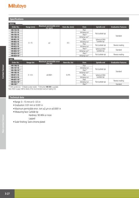 SpecificationsMetricOrderNo.149-132-10149-131-10149-183-10149-184-10149-801-10149-802-10149-821-10149-822-10149-803-10*2149-804-10*2149-823-10*2149-824-10*2InchOrderNo.149-148-10149-147-10149-185-10*3149-182-10149-811-10149-812-10149-831-10*2149-832-10*2149-181*2Range(mm)MaximumpermissibleerrorJMPE(µm)Stemdia.(mm)0-15±29.5Range(in)MaximumpermissibleerrorJMPE(in)Stemdia.(in)0-0.5±0.00010.375StemPlainW/clampnutPlain*1W/clampnut*1PlainW/clampnutPlainW/clampnutPlain*1W/clampnut*1Plain*1W/clampnut*1StemPlainW/clampnutPlain*1W/clampnut*1PlainW/clampnutPlainW/clampnutPlain*1SpindleendGraduationfeaturesFlat(carbidetip)Spherical(SR4)(carbidetip)StandardFlat(carbidetip)ReversereadingSpherical(SR4)(carbidetip)StandardFlat(carbidetip)ReversereadingSpindleendGraduationfeaturesFlat(carbidetip)Spherical(SR4)(carbidetip)Flat(carbidetip)StandardReversereadingStandard*1Withspindlelock*2Made-to-ordermodels*3W/rachet(149-181)isavailableNote:Refertopage3-68fordetailsoftherecommendedmaximumloadinglimit.Technicaldata•Range:0-15mmor0-0.5in•Graduation:0.01mmor0.001in•Maximumpermissibleerror:JMPE±2µmor±0.0001in•Measuringface:CarbidetipHardness:90HRAormoreLapped•Scalefinishing:Satin-chromeplated3-27