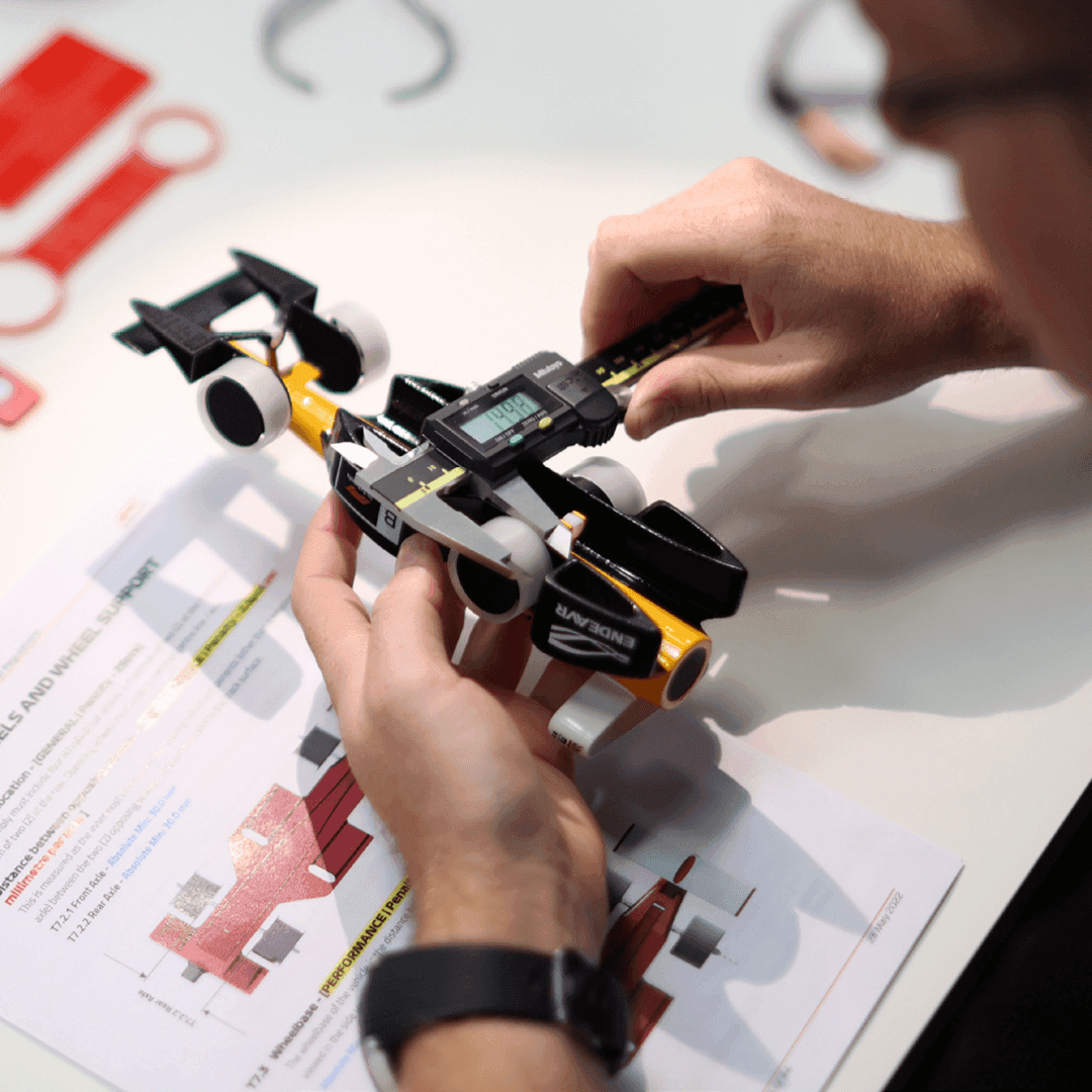 Scrutineering being completed using Mitutoyo measuring equipment at the Aramco 2022 F1 in Schools World Finals