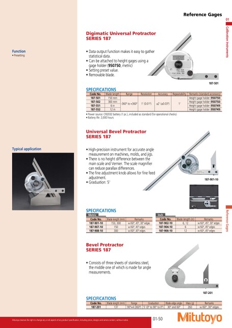 ReferenceGagesDigimaticUniversalProtractorSERIES187SPECIFICATIONSCodeNo.187-501187-502187-551187-552Bladelength150mm300mm6in12inRangeResolutionAccuracyRepeatability-360°to+360°1'(0.01°)±2'(±0.03°)1'187-501Remarks(standardaccessory)Heightgageholder(950750)Heightgageholder(950750)Heightgageholder(950749)Heightgageholder(950749)•Powersource:CR2032battery(1pc.),includedasstandard(foroperationalchecks)•Batterylife:2,000hoursUniversalBevelProtractorSERIES187•High-precisioninstrumentforaccurateanglemeasurementonmachines,molds,andjigs.•ThereisnoheightdifferencebetweenthemainscaleandVernier.Thescalemagniercanreduceparallaxdifferences.•Theneadjustmentknoballowsfornefeedadjustment.•Graduation:5'187-901-10ReferenceGagesInchCodeNo.187-902-10187-904-10187-906-10Bladelength(in)Remarks6,12612w/60°,45°,30°edgesw/60°,45°edgesw/60°,45°edgesSPECIFICATIONSMetricCodeNo.187-901-10187-907-10187-908-10Bladelength(mm)150,300150300Remarksw/60°,45°,30°edgesw/60°,45°edgesw/60°,45°edgesBevelProtractorSERIES187•Consistsofthreesheetsofstainlesssteel,themiddleoneofwhichismadeforanglemeasurements.SPECIFICATIONSCodeNo.187-201Bladelength(mm)RangeGraduationBladeedgeangleMass(g)Remarks13790°×4(360°)5'(0°to90°to0°)30°and60°260w/60°,30°edges187-20101-50•Dataoutputfunctionmakesiteasytogatherstatisticaldata.•Canbeattachedtoheightgagesusingagageholder(950750,metric)•Settingpresetvalue.•Removableblade.Function•PresettingTypicalapplication