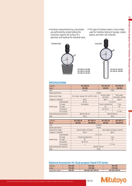 •Hardnessmeasurementsbyadurometerareperformedbysimplyholdingtheinstrumentagainstthesurfaceofaspecimenandreadingtheindicatedvalue.•Thistypeofhardnesstesterismostwidelyusedforhardnesstestingofsponge,rubber,plasticsandothersoftmaterials.CompacttypeLongtype811-329-10HH-329811-335-10HH-335811-337-10HH-337811-331-10HH-331811-333-10HH-333HardnessTesters811-329-10HH-329Compact811-331-10HH-331811-333-10HH-333LongAnalogSoftrubber,sponge,felt,hardfilm,fabricGeneralrubber,softplasticHardrubber,hardplastic,eboniteTypeEø5mmSemi-sphere—68×34×146mm300gTypeAø1.25mmCirculartruncatedcone35°ø0.79mm—TypeDCone30°—0.1mm68×35×188mm320g811-335-10HH-335811-335-11HH-335-01811-337-10HH-337811-337-11HH-337-01CompactAnalogGeneralrubber,softplasticHardrubber,hardplastic,eboniteTypeACirculartruncatedcone35°ø0.79mm—ø1.25mm68×34×146mm300gTypeDCone30°—0.1mmSPECIFICATIONSCodeNo.ModelTypeDisplayspecificationMeasurementtargetCategoryinstandardsNeedleshapeShaftdiameterTipshapeTipangleTipdiameterTipcurvatureExternaldimensions(W×D×H)MassCodeNo.ModelTypeDisplayspecificationMeasurementtargetCategoryinstandardsNeedleshapeShaftdiameterTipshapeTipangleTipdiameterTipcurvatureExternaldimensions(W×D×H)MassOptionalAccessoriesforDual-purposeStandCTSSeriesCodeNo.ModelApplicablemodels811-019CTS-101HH-331811-012CTS-102811-013CTS-103HH-333/337/337-01HH-335/335-0110-10